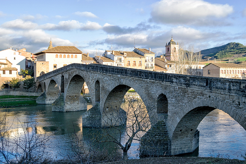 Aquí el nexo común es el Camino de Santiago, peregrinación nacida de un impulso religioso al que pronto se unió el afán repoblador y después, el noble estímulo mercantil. Se ve que la paz de la conciencia atrae a los moscones del cambalache desde inmemorial. Los peregrinos rindieron provecho a esta tierra y todavía lo hacen. Puente la Reina es hija del paso construido sobre el río Arga, y de su importancia escribe Picaud en una Guía del Peregrino del Codex Calixtinus que omite referencia a Santa María de Eunate, iglesia atribuida a los templarios con el mismo fundamento -ninguno- que la fantasía fuerista sacó de su manga la etimología de Cien puertas. Viana (que más parece cementerio que pueblo) y Sangüesa prosperaron al calor del Camino, igual que Tafalla con los peregrinos que enfilaban al norte atravesando el cerco de Artajona. También Estella es escala jacobea, y quizá su origen franco la libró del vapuleo general que el franco Picaud suministra a los navarros.